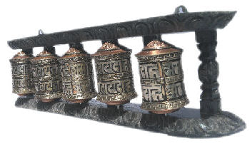 Tibetan prayer wheels (called Mani wheels by the Tibetans) are devices for spreading spiritual blessings and well being. Rolls of thin paper, imprinted with many, many copies of the mantra (prayer) Om Mani Padme Hum, printed in an ancient Indian script or in Tibetan script, are wound around an axle in a protective container and spun around and around. Typically, larger decorative versions of the syllables of the mantra are also carved on the outside cover of the wheel.