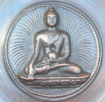 6" bowl is decorated with Tibetan chanting of compassion "Om Mane Pad Mei Hum" around the bowl and inside the bowl is Earth Touching Buddha