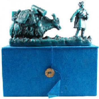 Tibetan man traveling with yak in wood looking with handmade Lokta paper box is hand painted hand cast high density resin made in Nepal.